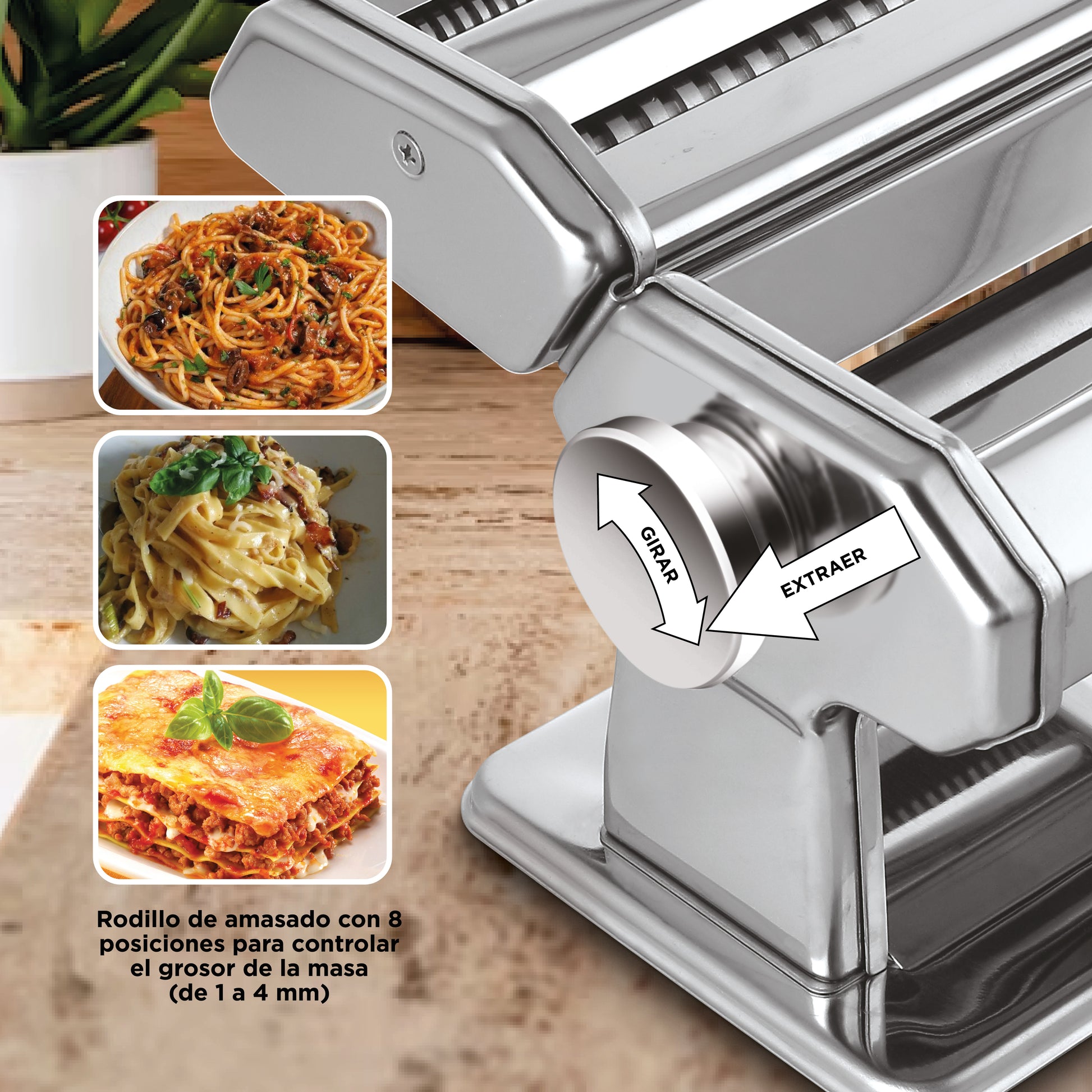 Rodillo de amasado con 7 posiciones para controlar el grosor de la masa (de 0,5 a 3mm). Diferentes rodillos para hacer spaghetti, fetuccini y lasagna.
