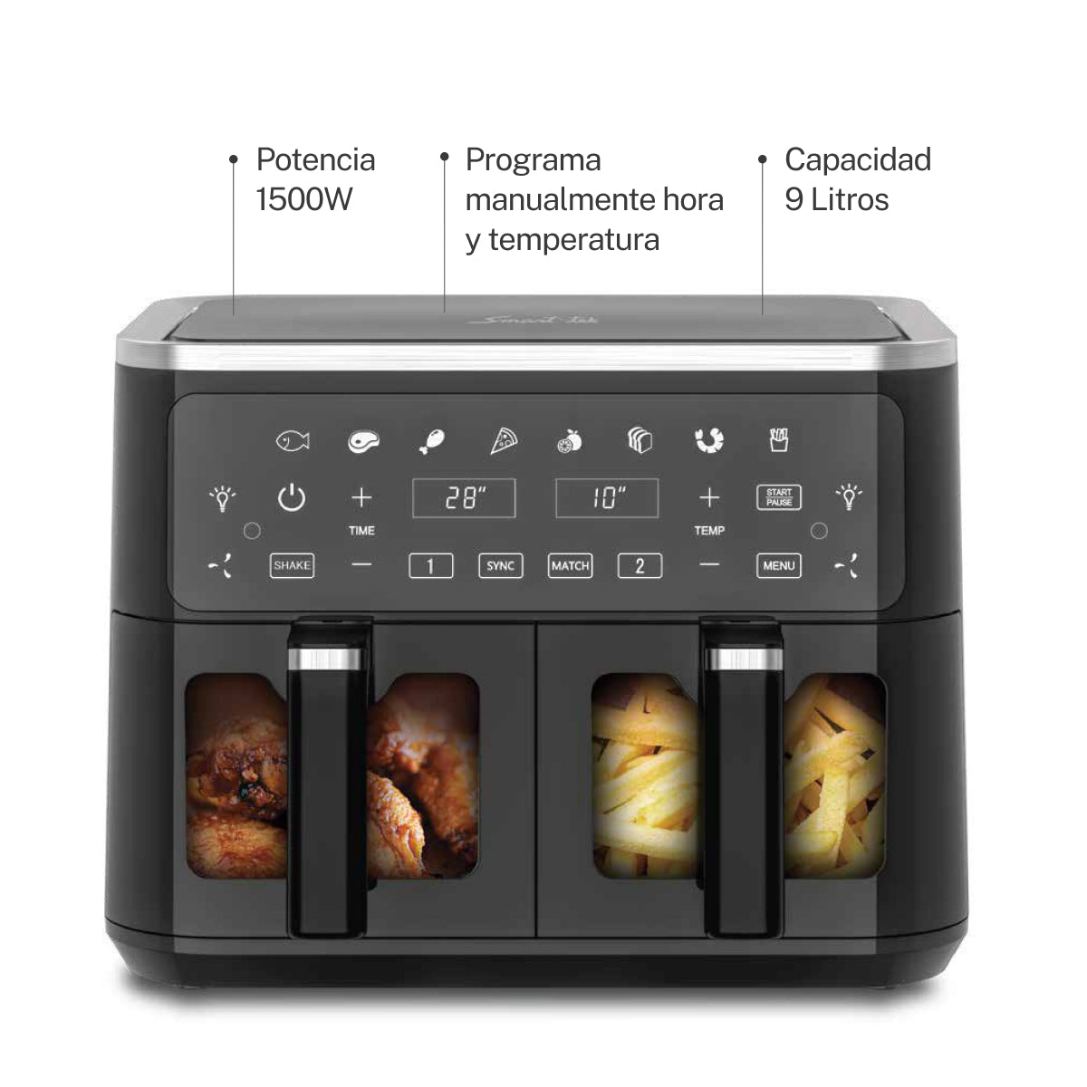- Capacidad: 9 litros, con doble canasta de 4,5 litros cada una, ideal para cocinar grandes porciones.